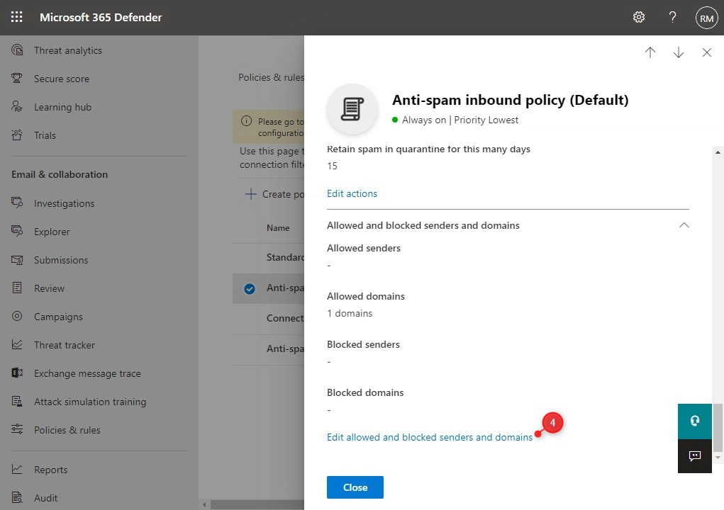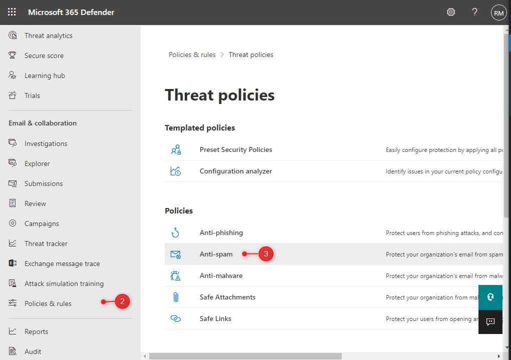 - Open the Anti-Spam policies