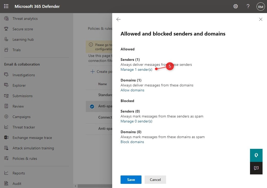 - Scroll all the way down in the fly-out and click on Edit allowed and blocked senders and domains
