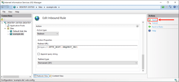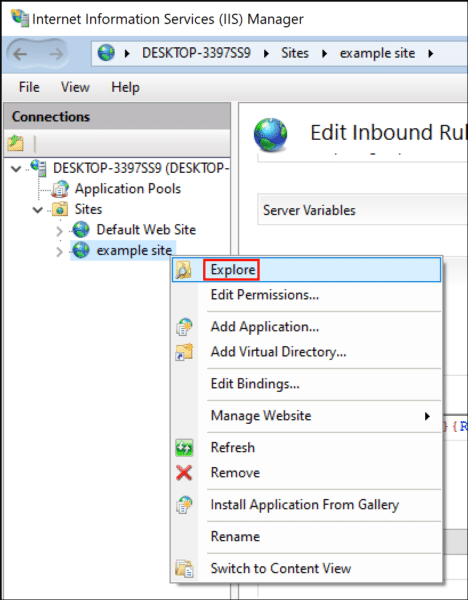 - You can now check your redirect in a web browser. If there are any problems, you can check the site’s web.config file to make sure it contains the correct information. In IIS Manager, right-click your site and choose Explore from the menu.