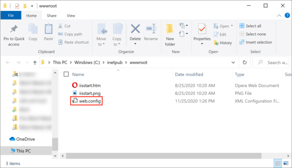 - Confirm that the file web.config exists, then open it in a text editor.