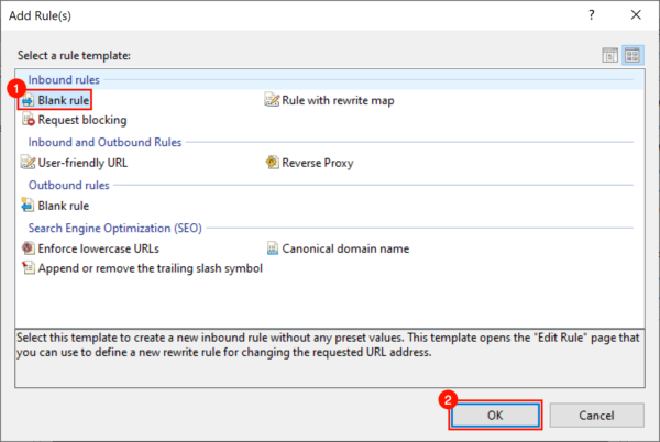 - Select Blank rule in the Inbound rules section, then click the OK button.